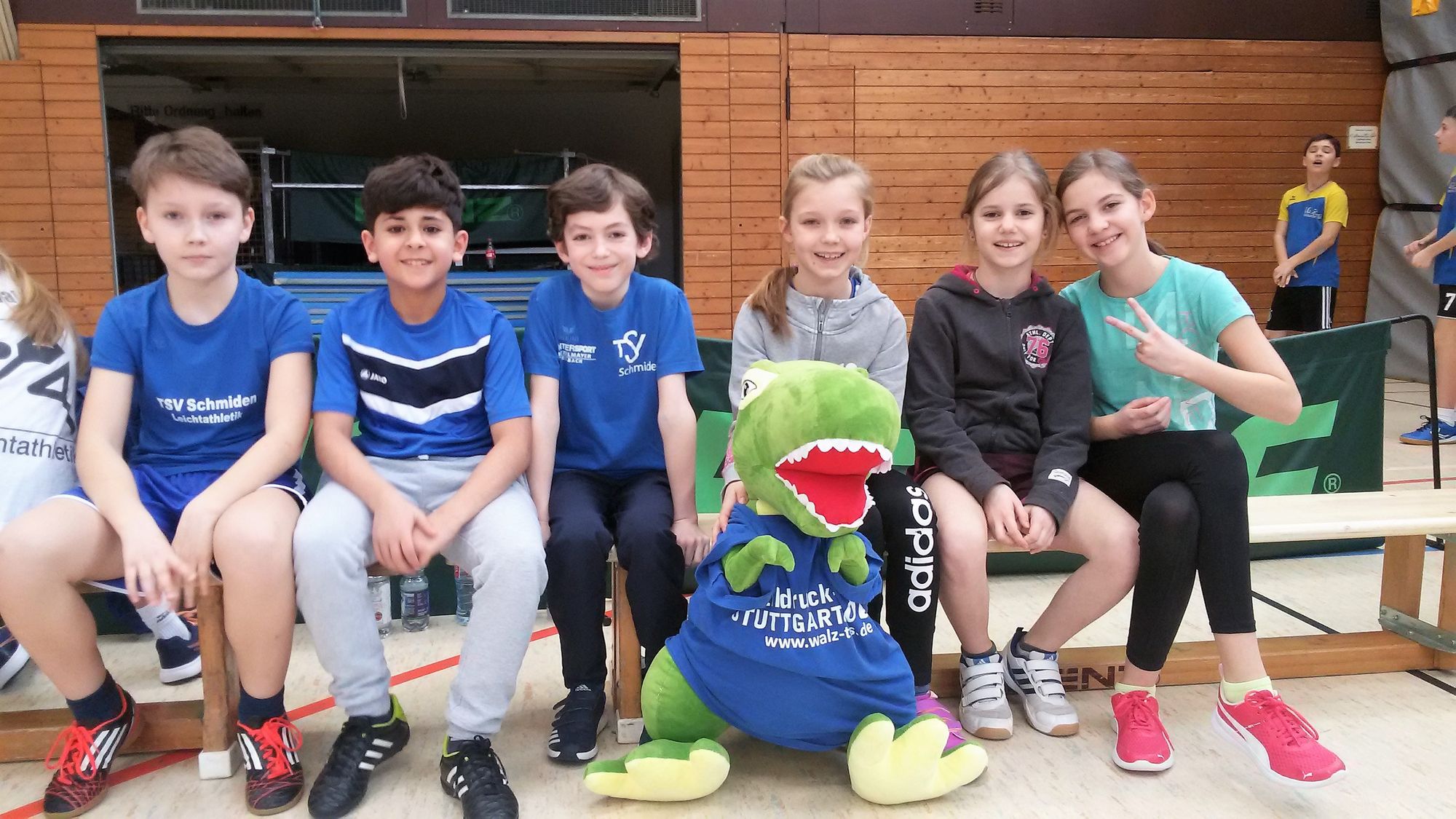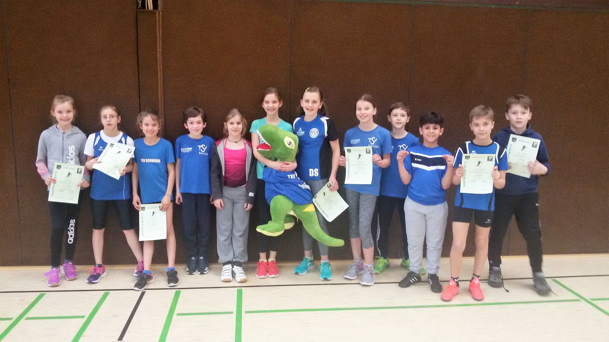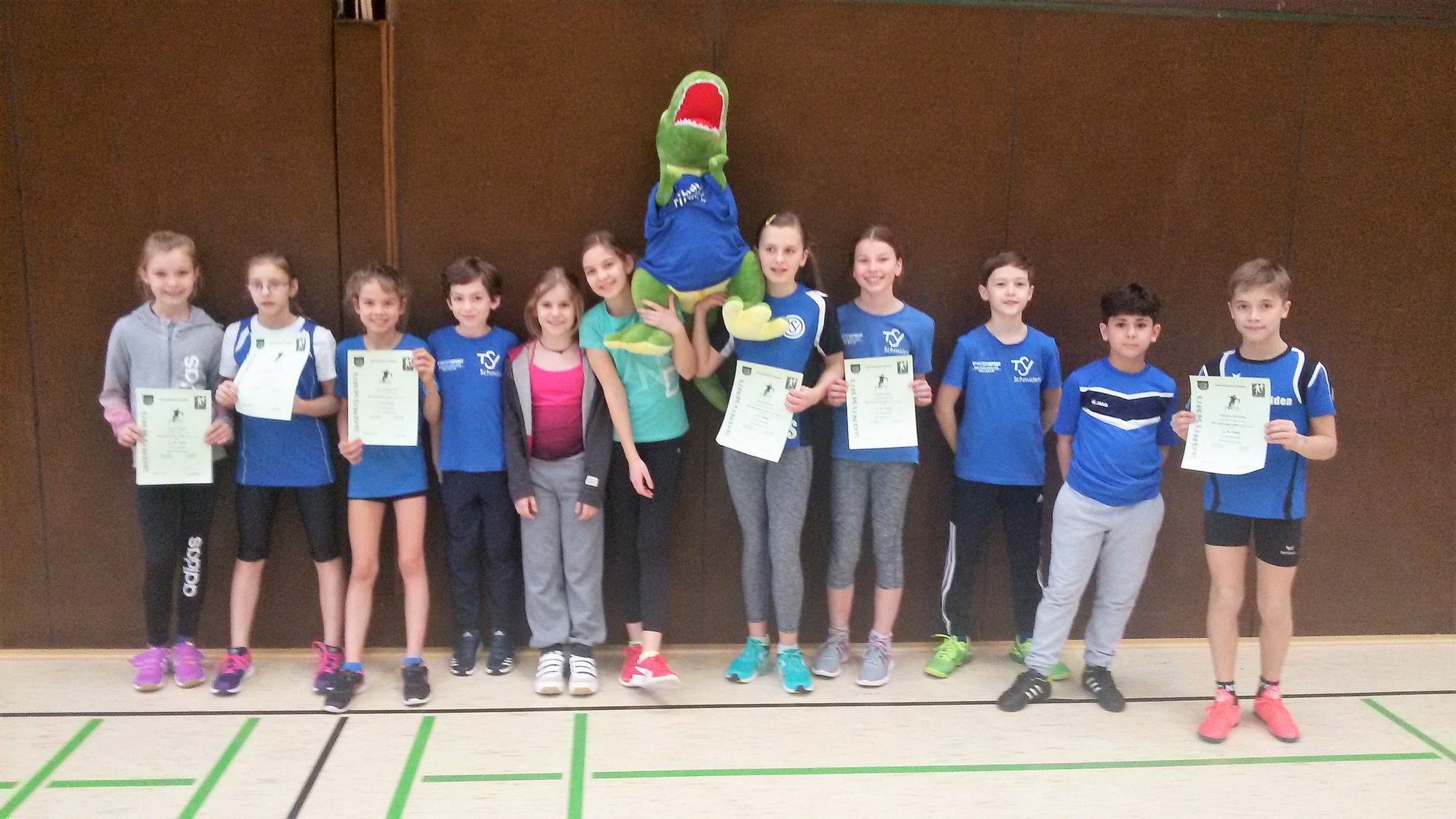 Am vergangenen Samstag (9.2.2019) fand für die Leichtathletikkinder der U8, U10 und U12 in Winnenden ein Hallenwettkampf statt. Begleitet wurden die Kinder nicht nur von ihren Trainern, sondern auch von ihrem neuen Maskottchen, dem SchmidoDino „Schmidolin“. Für die U12 war es der erste Hallenwettkampf der Saison, da beim letzten Wettkampf in Plüderhausen leider kein Team an den Start gehen konnte. Der Tag war vor allem für die Athleten der U8 sehr erfolgreich! Hier siegte das Team des TSV Schmiden gemeinsam mit einigen Kindern aus Kernen. Mit dabei waren hier Meghan und Tom Trevelyan, Marlon Träbert, Emilia Özalp und Samuel Horvat. Die kleinen Leichtathleten der erfolgreichen Startgemeinschaft konnten sehr zufrieden mit der Goldmedaille um den Hals nach Hause gehen!