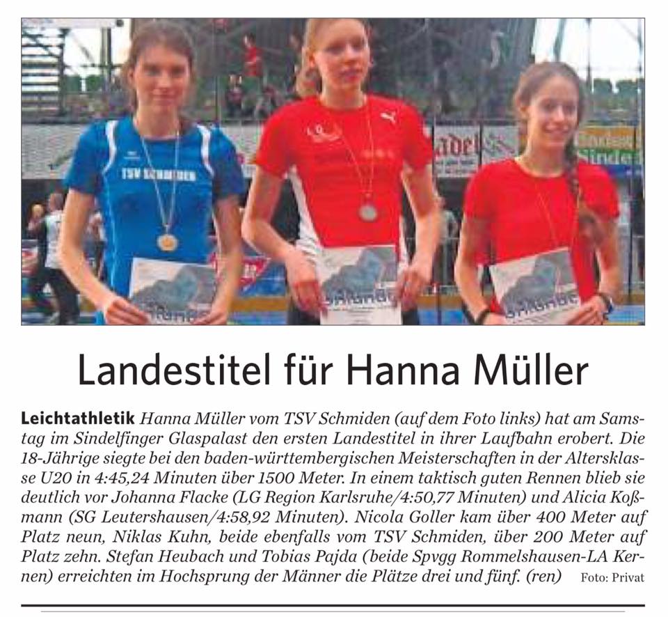 Leichtathletik Hanna Müller vom TSV Schmiden (auf dem Foto links) hat am Samstag im Sindelfinger Glaspalast den ersten Landestitel in ihrer Laufbahn erobert. Die 18-Jährige siegte bei den baden-württembergischen Meisterschaften in der Altersklasse U20 in 4:45,24 Minuten über 1500 Meter. In einem taktisch guten Rennen blieb sie deutlich vor Johanna Flacke (LG Region Karlsruhe/4:50,77 Minuten) und Alicia Koßmann (SG Leutershausen/4:58,92 Minuten). Nicola Goller kam über 400 Meter auf Platz neun, Niklas Kuhn, beide ebenfalls vom TSV Schmiden, über 200 Meter auf Platz zehn. Stefan Heubach und Tobias Pajda (beide Spvgg Rommelshausen-LA Kernen) erreichten im Hochsprung der Männer die Plätze drei und fünf. (ren)